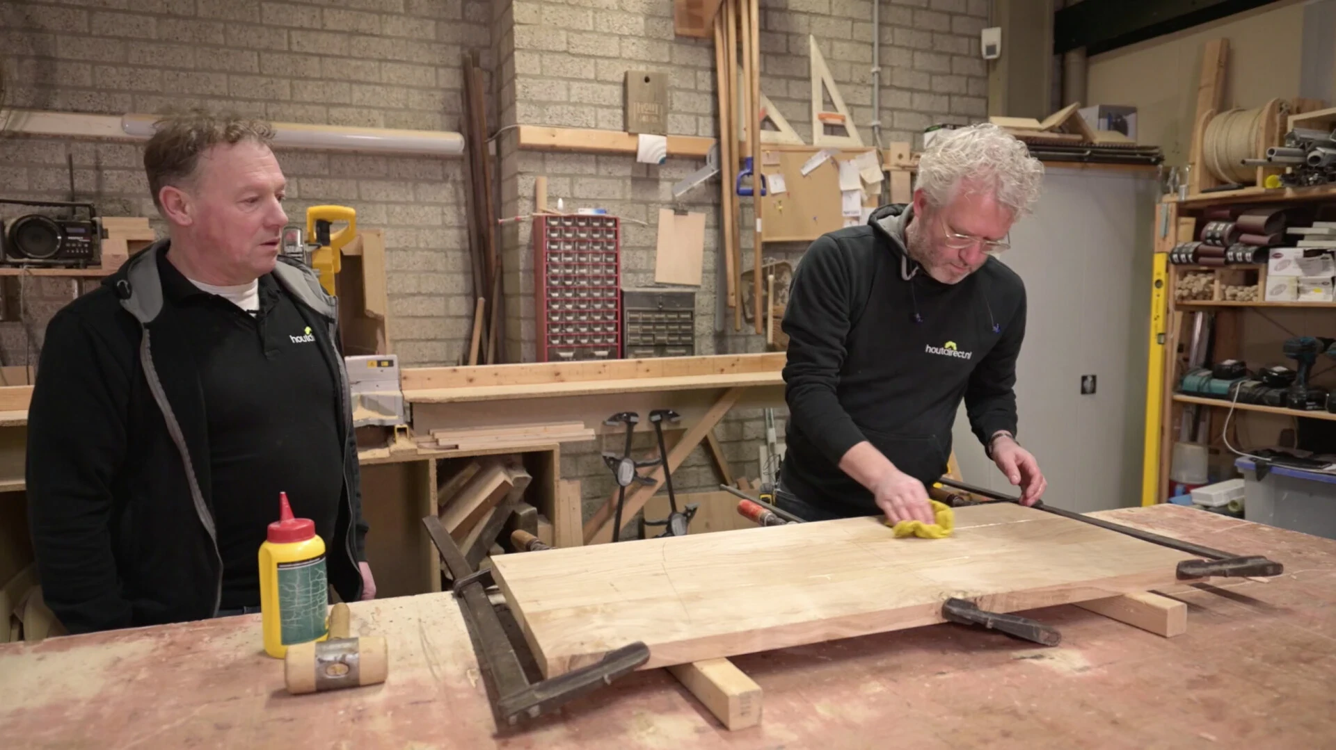 Poets met een nat doekje vervolgens alle overtollige lijm van de plank die aan de bovenkant is komen te liggen na het persen.